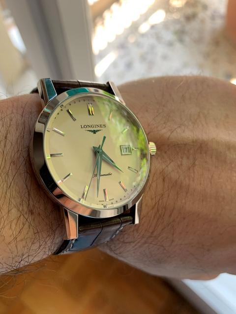 Ευχαριστώ και πάλι για τις απαντήσεις σας ,το ρολόι το πήρα και είναι το Longines. Αγοράστηκε από εξουσιοδοτημένο στο κέντρο κοντά Σύνταγμα και είναι πραγματικά πολύ όμορφο.Τα μόνα αρνητικά που θεωρώ ότι έχει είναι τα λίγο μεγάλα αυτάκια (lugs) για να μπαίνει το λουρί ,το συνηθίζει αυτό η Longines στα μοντέλα της και ότι η κορώνα φαίνεται να μην ακουμπάει πάνω στην κάσα του ρολογιού .Δεν ξέρω αν είναι σχεδιαστικό λάθος ή απλός έτσι είναι ,πάντως δημιουργεί μια ανησυχία για την είσοδο νερού.Ορίστε και μια γρήγορη φωτό του 1832.