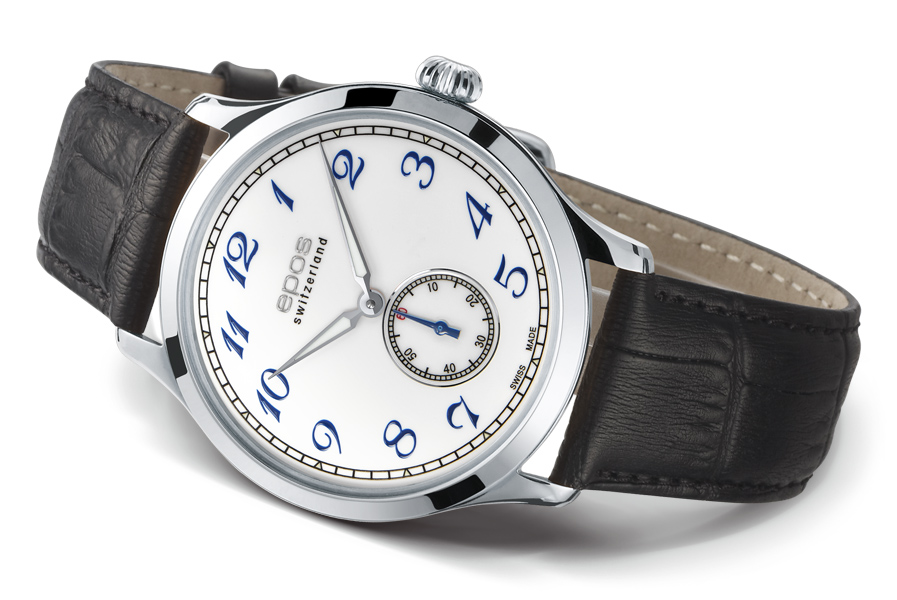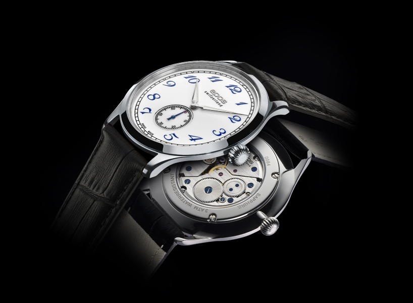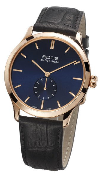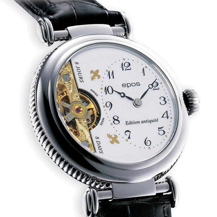 This masterpiece is based on a more than a century old vintage Hebdomas movement. It is hand-wound and has an 8-days power reserve. The mechanical beauty can be seen through a semi-open lacquered dial that is housed in a stainless steel case. The unique design has given the EPOS brand its distinctive look for many years. Amongst others, this model has won the prestigious German “Goldene Unruh” award for being the most beautiful watch in its class in 2004.