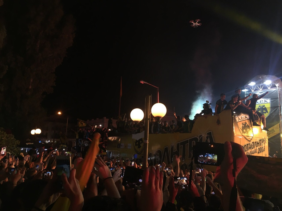 και ο κοσμος ξεσπασε στους δρόμους της Φιλαδέλφειας. Το ανοιχτό πούλμαν με τους πρωταθλητές να φεύγουν από το γήπεδο, με προορισμό την Σκεπαστή χρειάστηκε ώρες να φτάσει. Μαγικές ώρες όμως. Τρελό πάρτι. Κόσμος πολύς. Εκαντοντάδες χιλιάδες στους δρόμους να πανηγυρίζει για την επιστροφή. Φιέστα. Νέοι, γυναίκες, παιδιά, γεροντάκια, άντρες, έφηβοι. Μάτια κλαμένα. Να προσπαθεί ο καθένας μας να αποβάλει από πάνω του τα 24χρόνια και να ζήσει τις στιγμές. Μέχρι τις πρώτες πρωινές ώρες ο κόσμος δεν έφευγε από τους δρόμους της Φιλαδέλφεια. Πάρτι σε κάθε μαγαζί. Ο ύμνος να παίζει στη διαπασών, η ΑΕΚ γύρισε. Ηταν η αρχή για τα καλύτερα που έρχονται… Ήταν 5 Μαϊου.