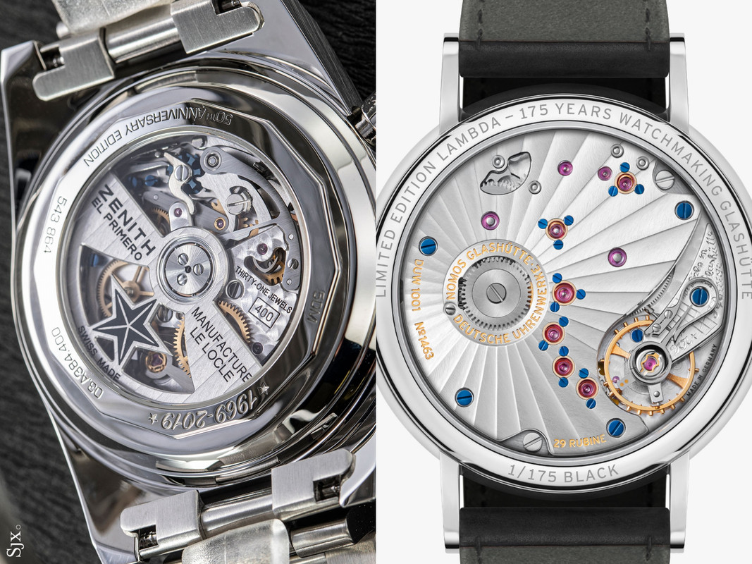 Το κρύσταλλο είναι ζαφείρι αλλά δεν νομίζω να έχει κάποιο AR coating καθώς οι αντανακλάσεις είναι πολύ έντονες. Επίσης ζαφείρι είναι και το κρύσταλλο στην πίσω πλευρά του ρολογιού, εκεί όπου η θέαση του μηχανισμού είναι απλά υπέροχη. Δεν έχω μετρήσει τις ώρες που αφιέρωσα στο να κοιτάζω με μεγεθυντικό φακό και να αντιπαραθέτω, όχι να συγκρίνω φυσικά, τον El Primero (Α384) με τον DUW 1001 (Lambda). Νοιώθω πολύ τυχερός που μπορώ να έχω τέτοια δείγματα υψηλής ωρολογοποιίας στα χέρια μου. Από την μία ο El Primero, ένας γυμνός, γραμμωμένος, ταχύτατος εργάτης και από την άλλη ένας εκλεπτυσμένος Κύριος, κουστουμαρισμένος με άκρως παραδοσιακό και αυστηρό στυλ.